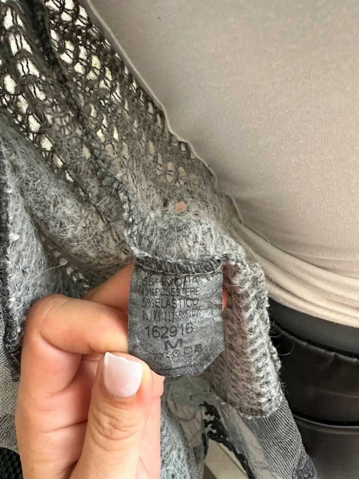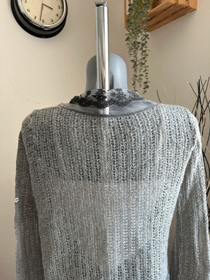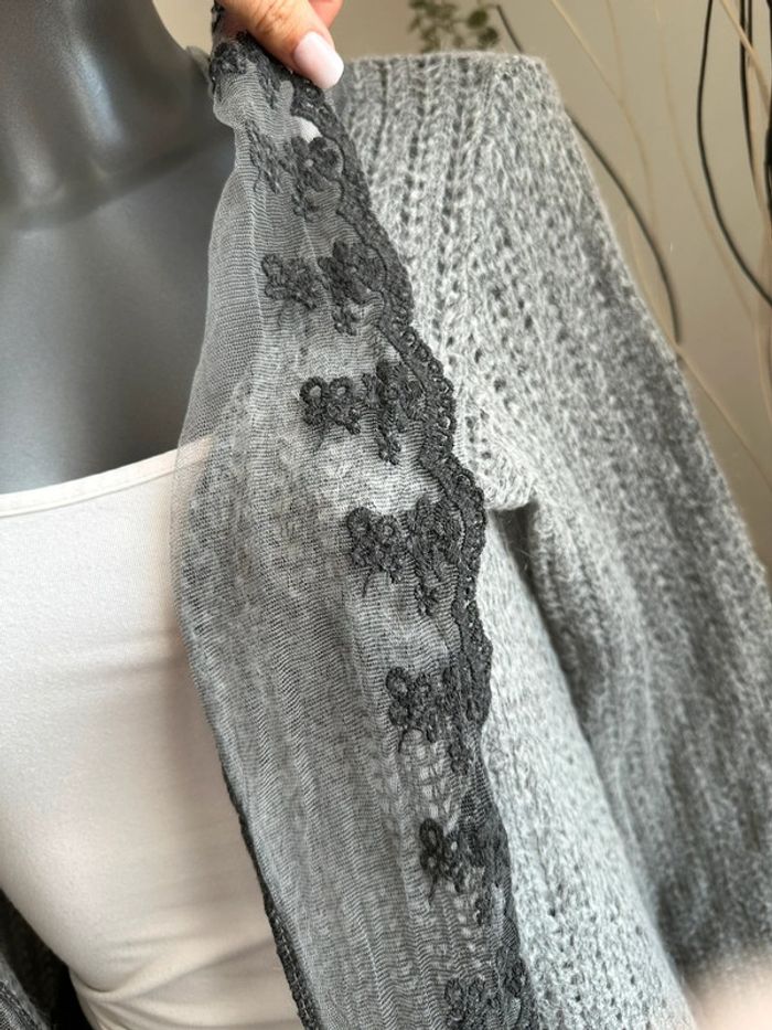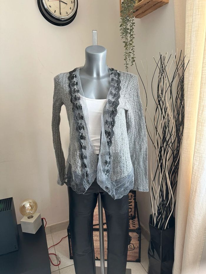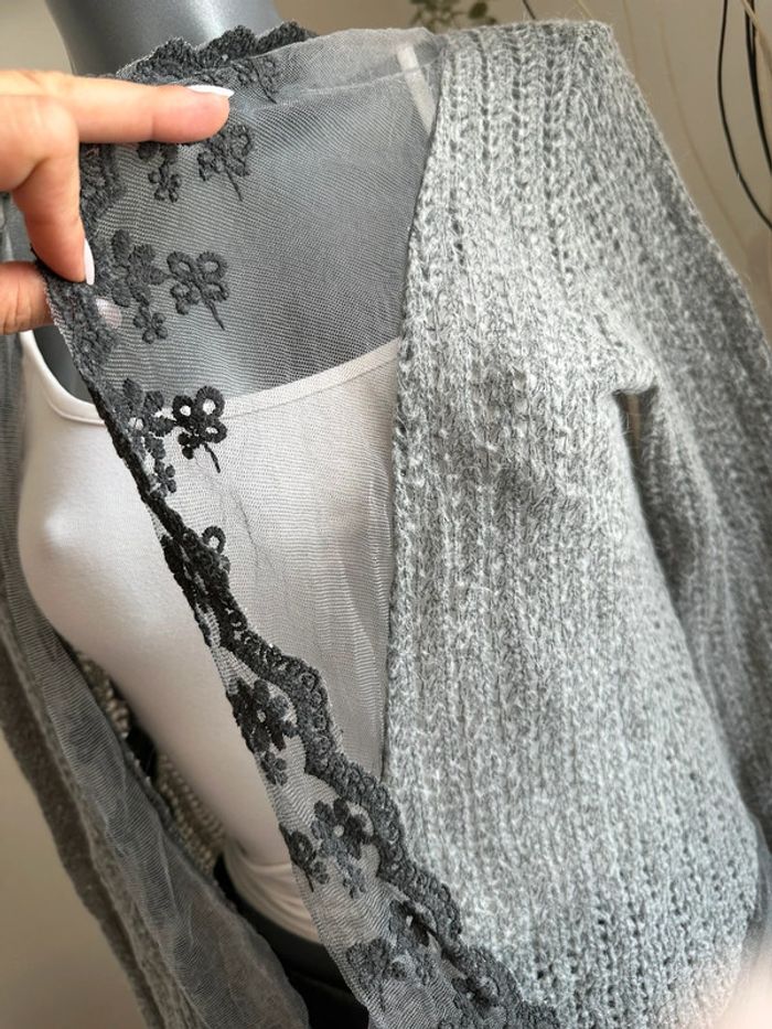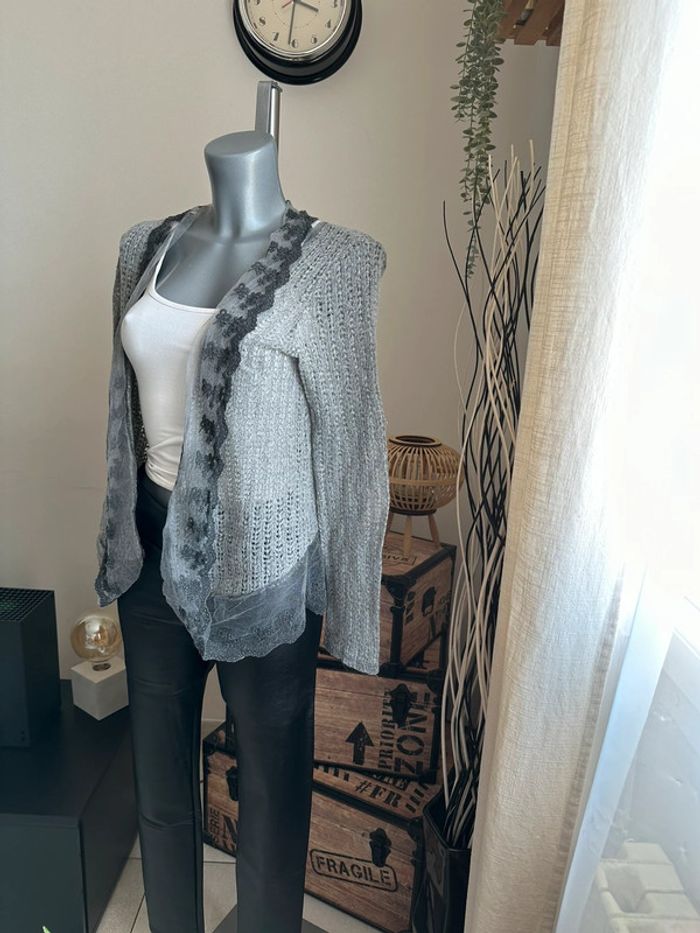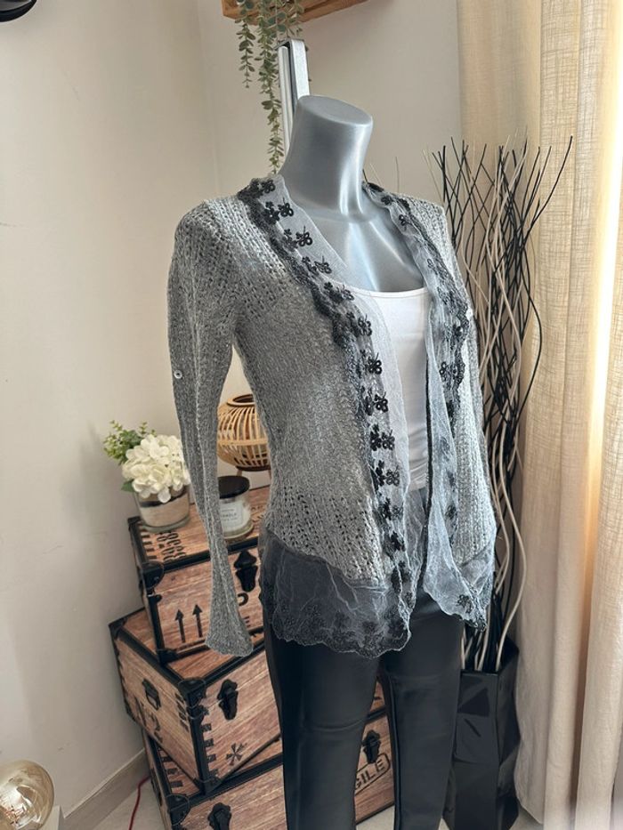 Gilet en laine ajourée grise , volant en dentelle brodé grise le bord du gilet , manches longues Taille M. sans marque. Seconde main en très bon état