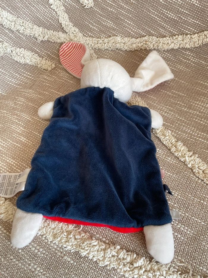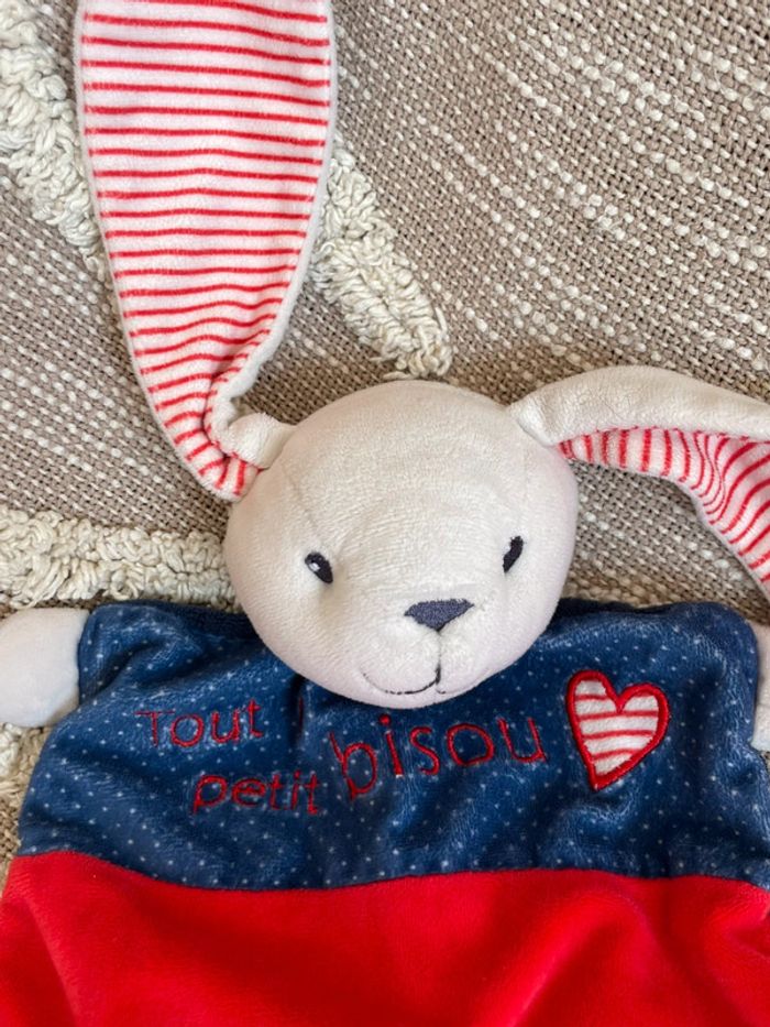 Peluche doudou plat 28cm mots d’enfants lapin bleu et rouge parfait état - photo numéro 3