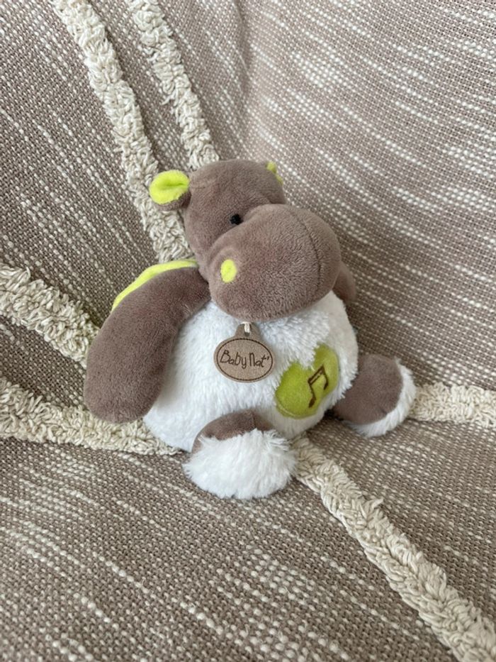 Peluche doudou musical 19cm Babynat hippopotame vert marron parfait état - photo numéro 1