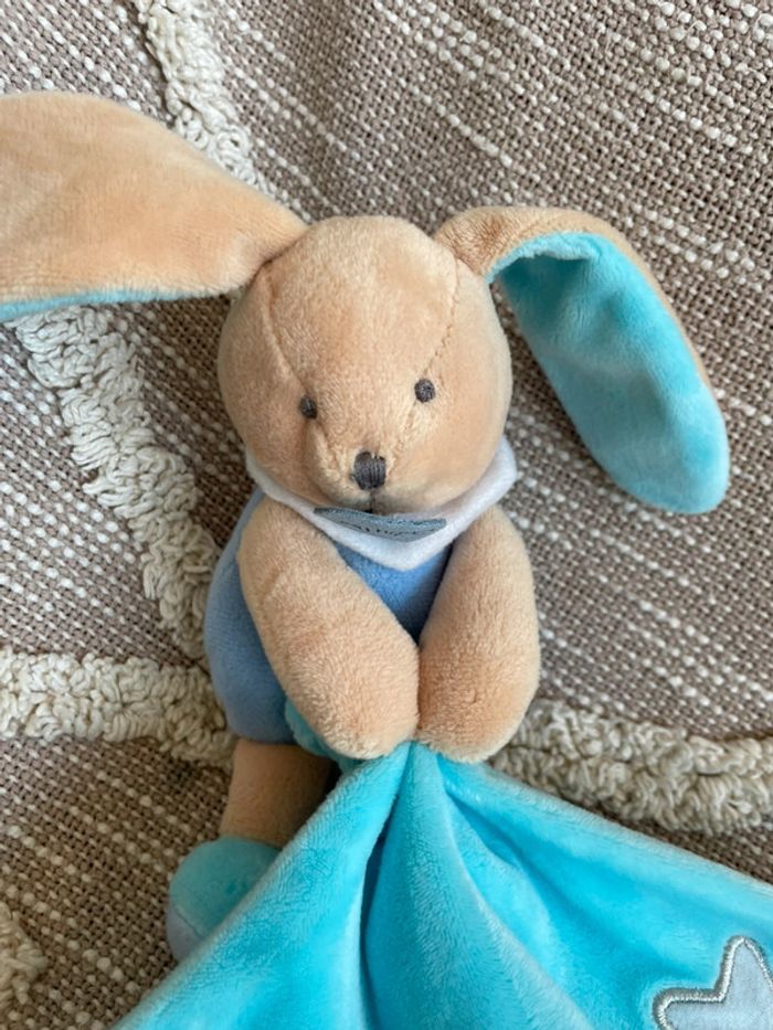 Peluche doudou mouchoir Babynat lapin beige et bleu très bon état - photo numéro 2
