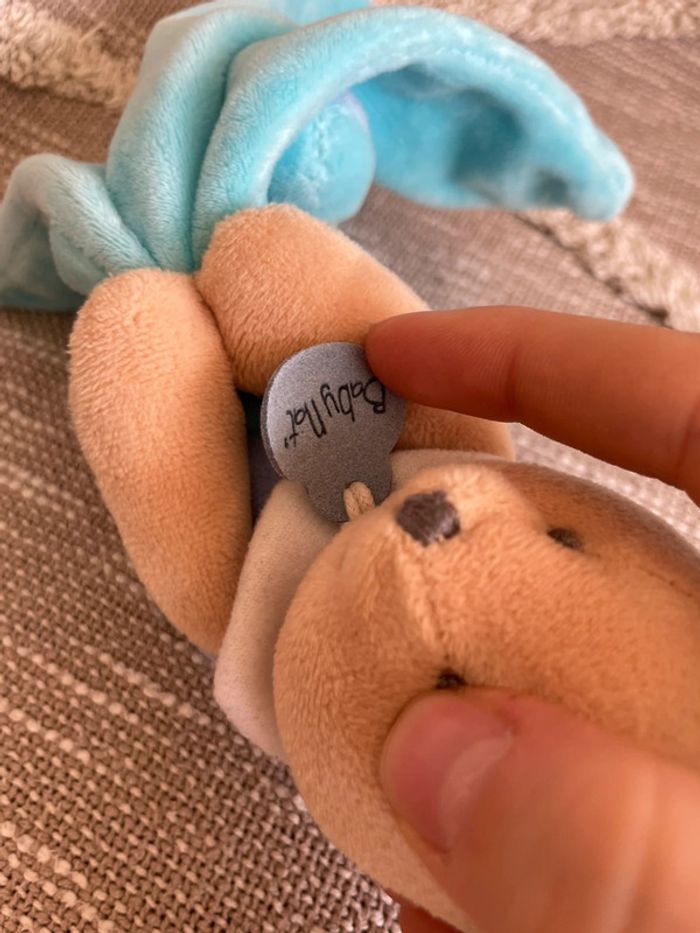 Peluche doudou mouchoir Babynat lapin beige et bleu très bon état - photo numéro 4