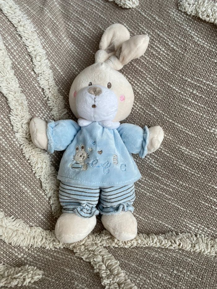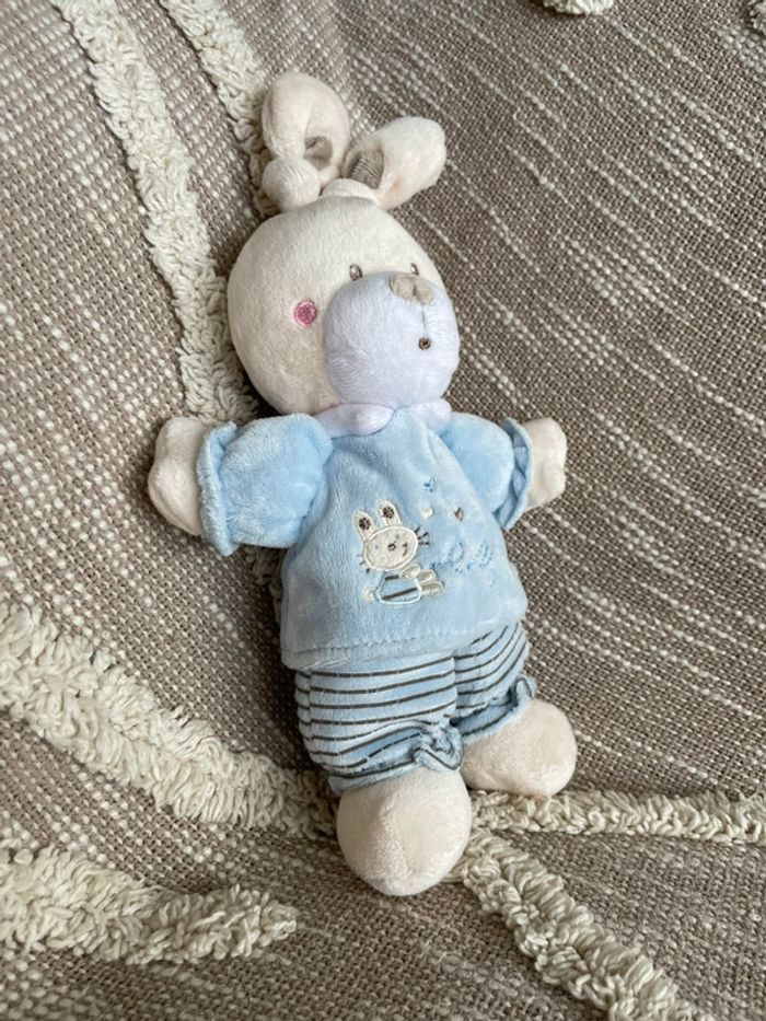 Peluche doudou 28cm Nicotoy lapin blanc et bleu rayé très bon état - photo numéro 1