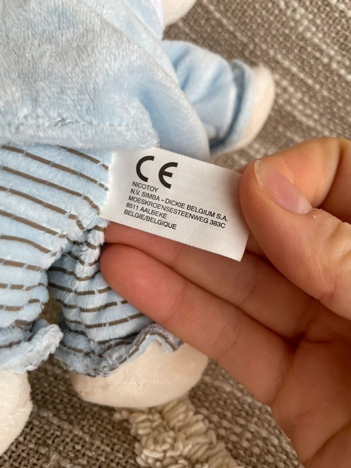 Peluche doudou 28cm Nicotoy lapin blanc et bleu rayé très bon état - photo numéro 4
