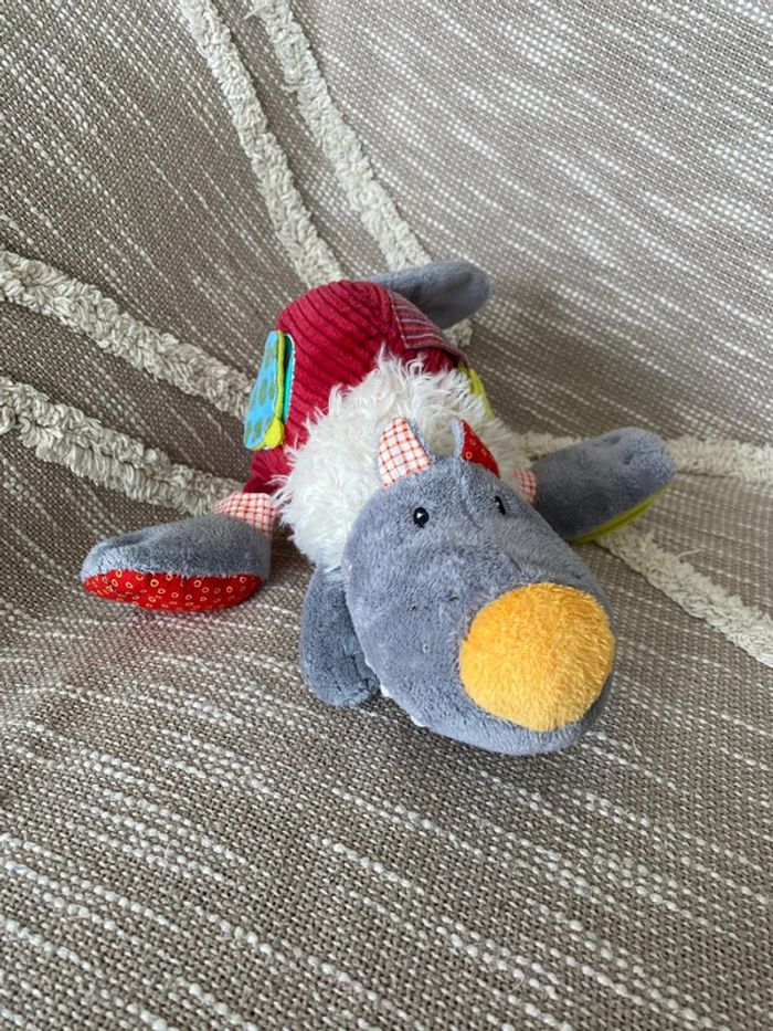 Peluche doudou d'éveil 26cm Lilliputiens loup gris et rouge à rayures parfait état - photo numéro 1