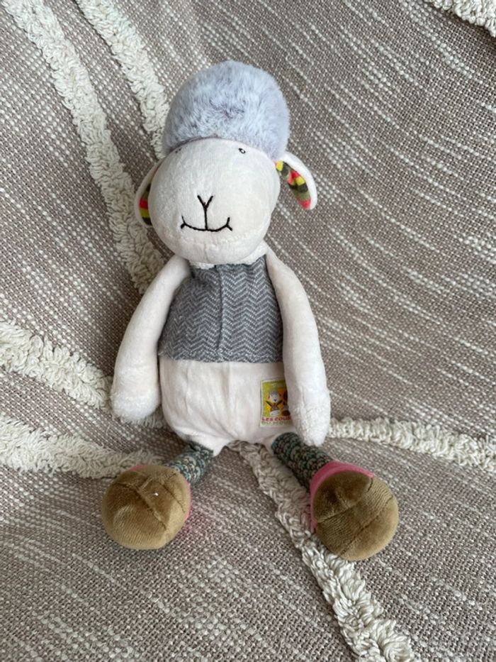 Peluche doudou 32cm moulin roty mouton brebis beige gris et rose vert très bon état - photo numéro 1