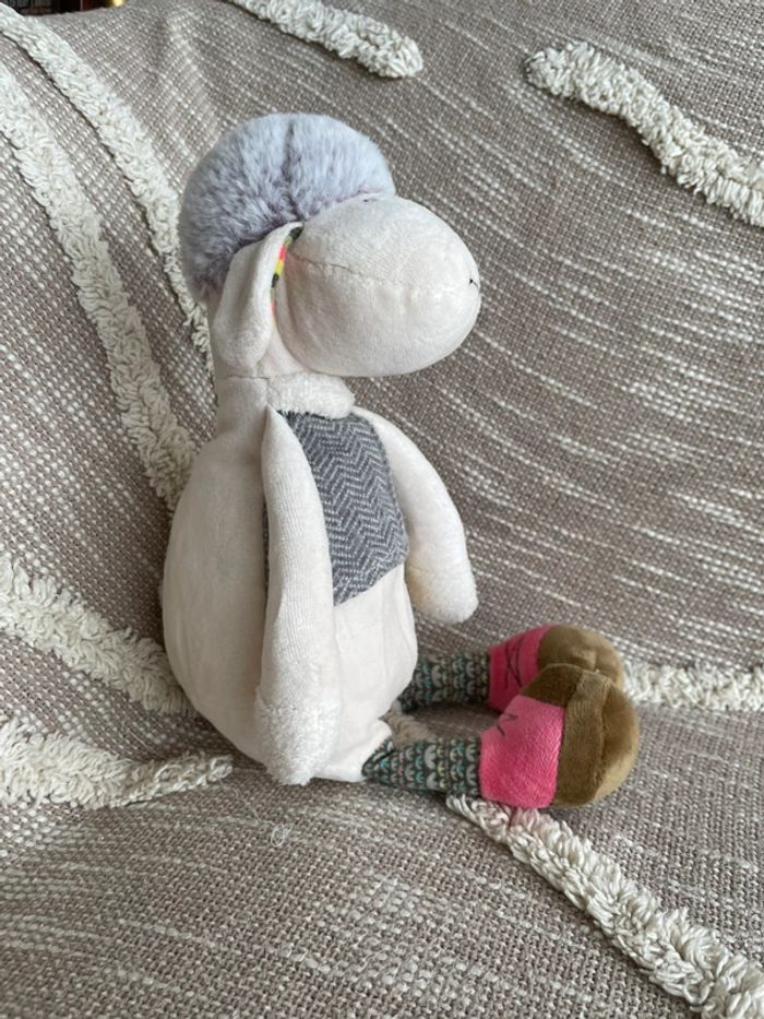 Peluche doudou 32cm moulin roty mouton brebis beige gris et rose vert très bon état - photo numéro 2