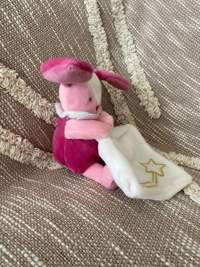 Peluche doudou mouchoir 16cm Babynat lapin rose et blanc étoile filante parfait état - photo numéro 1