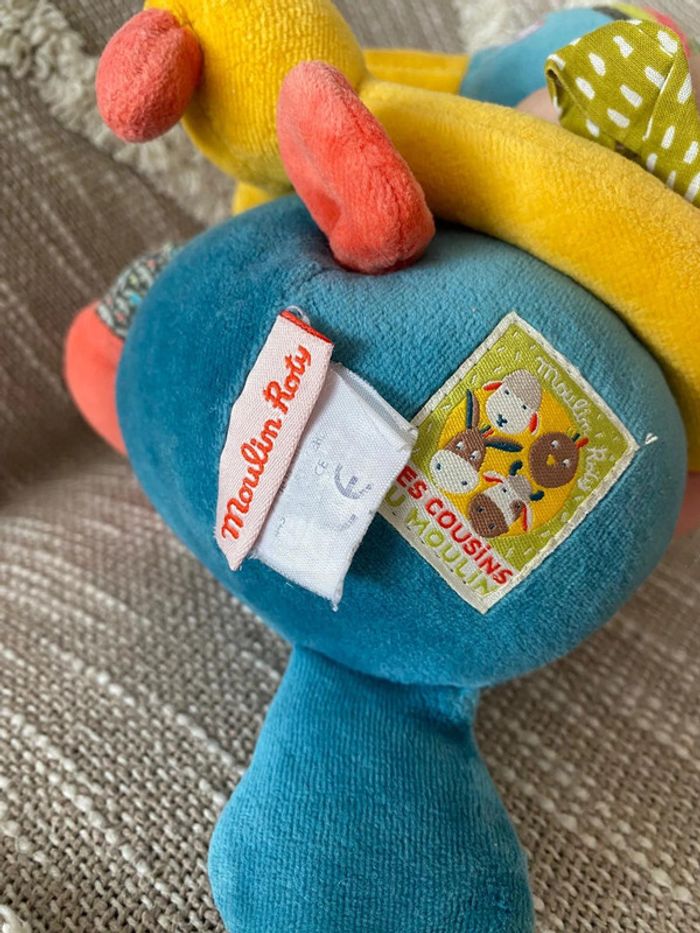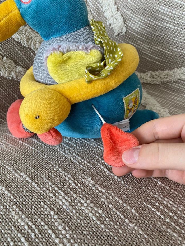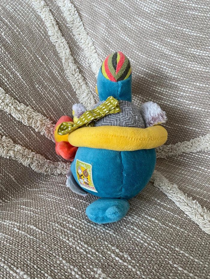Peluche doudou musical 24cm moulin roty les cousins canard bleu et jaune rose très bon état - photo numéro 4