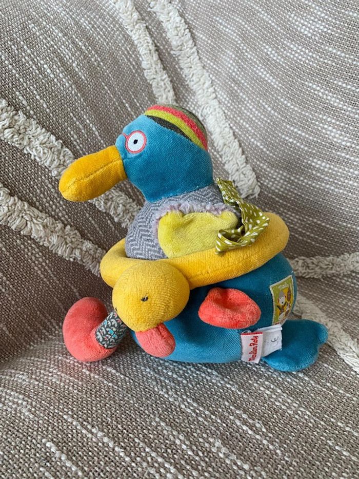 Peluche doudou musical 24cm moulin roty les cousins canard bleu et jaune rose très bon état - photo numéro 1