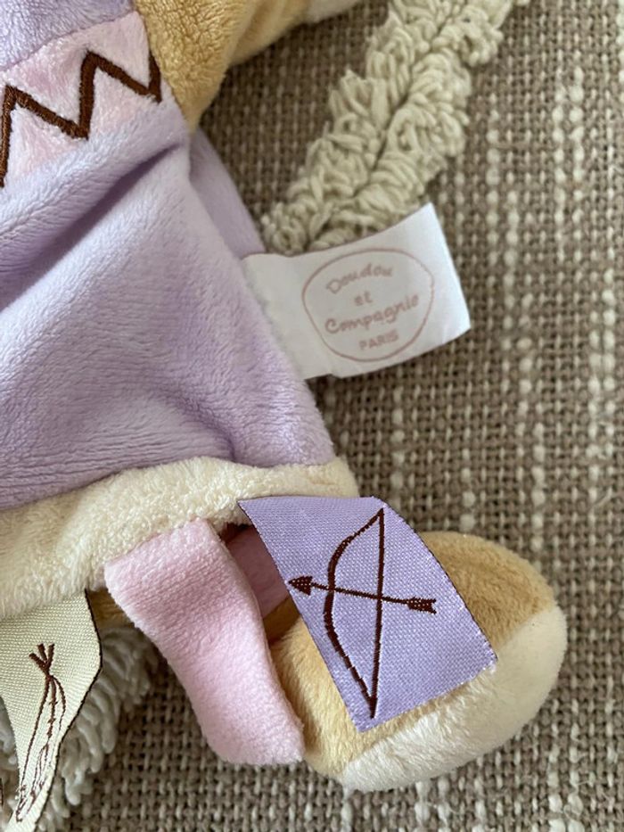 Peluche doudou et compagnie marionnette 27cm lapin indien beige marron et violet très bon état - photo numéro 4