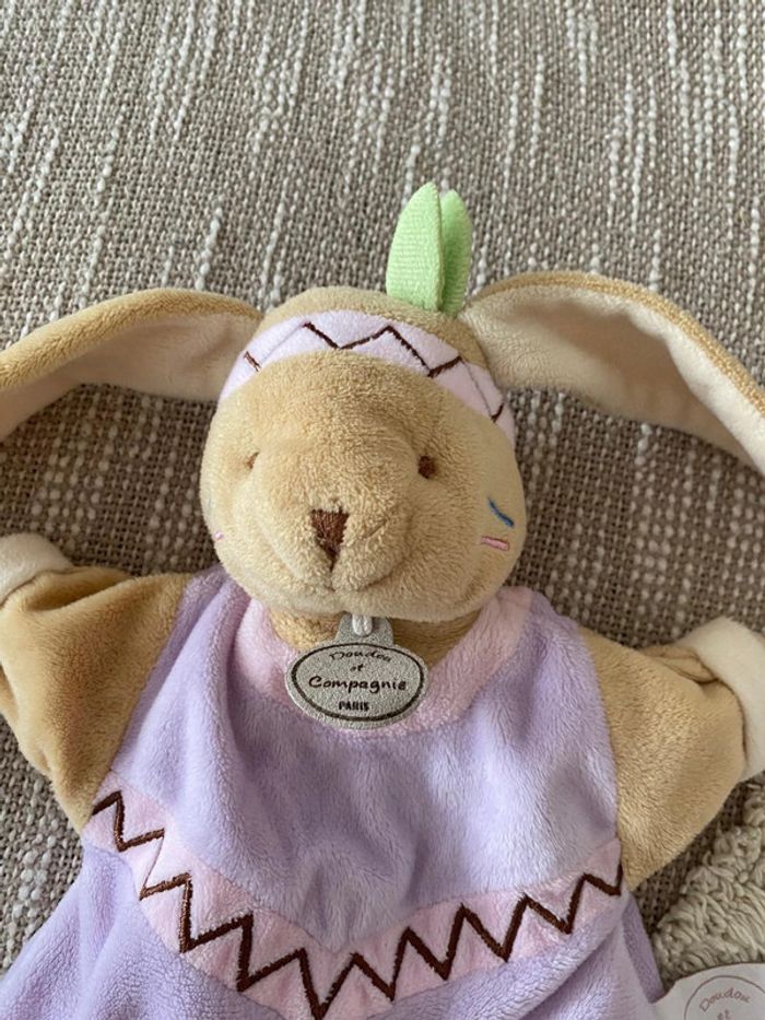 Peluche doudou et compagnie marionnette 27cm lapin indien beige marron et violet très bon état - photo numéro 1