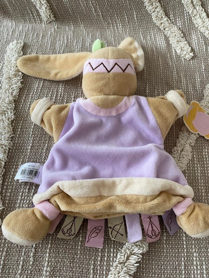 Peluche doudou et compagnie marionnette 27cm lapin indien beige marron et violet très bon état