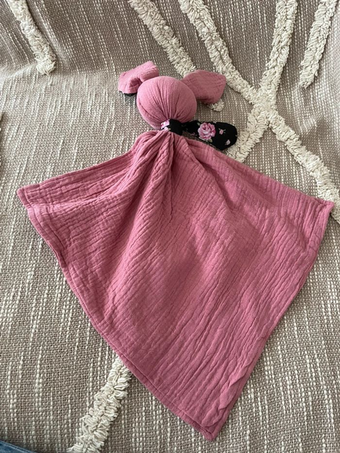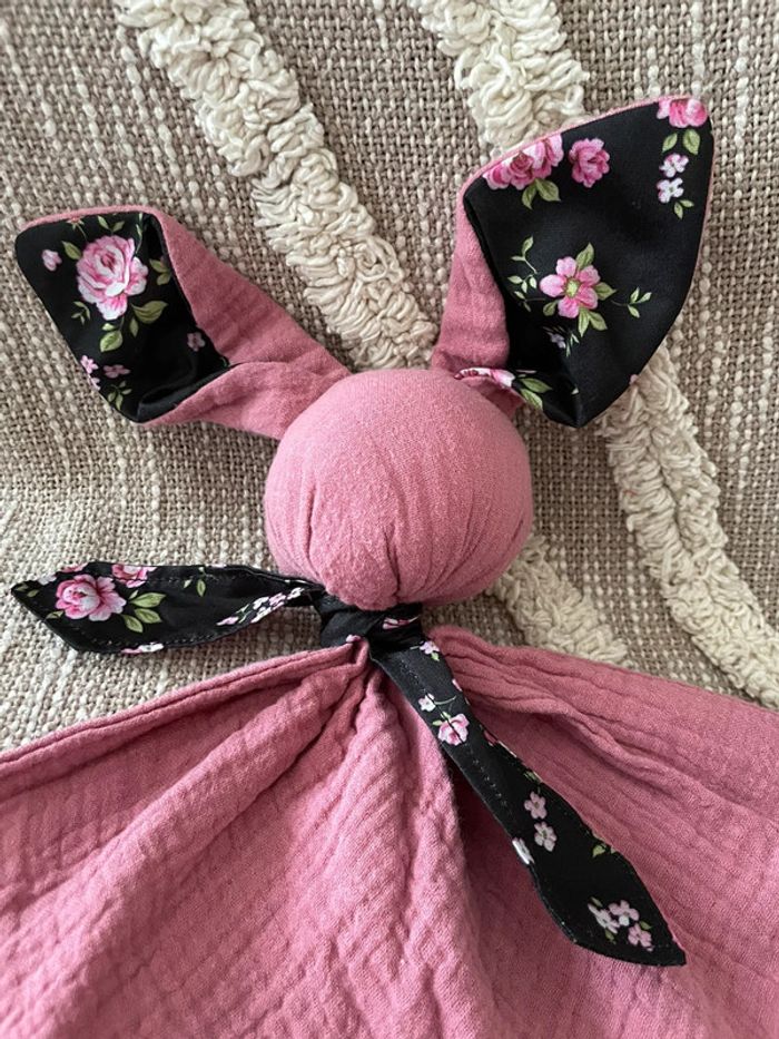 Peluche doudou plat 43cm fait main gaze Gabin le lapin rose et coton noir à fleur rose neuf - photo numéro 3