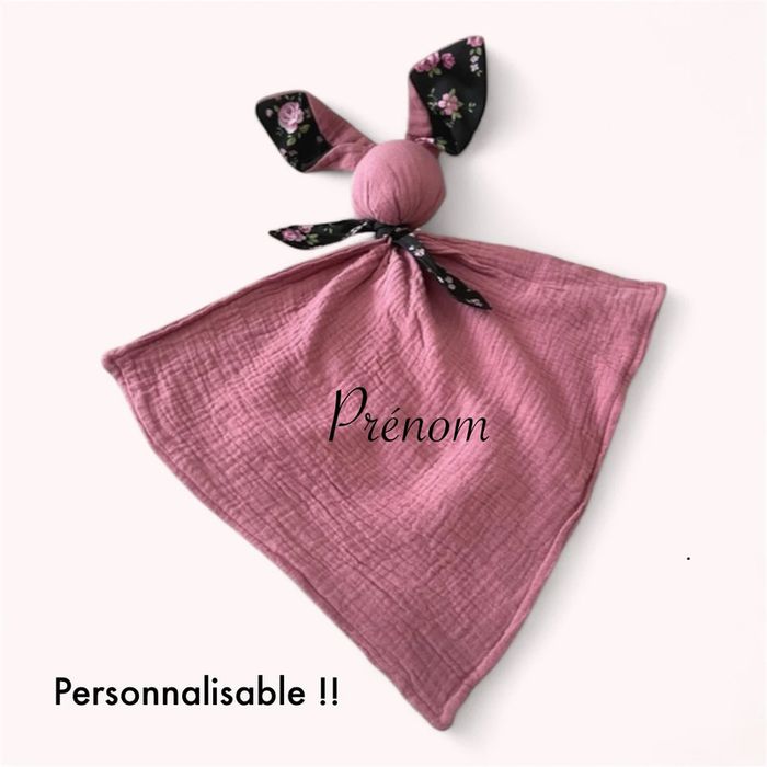 Peluche doudou plat 43cm fait main gaze Gabin le lapin rose et coton noir à fleur rose neuf - photo numéro 1