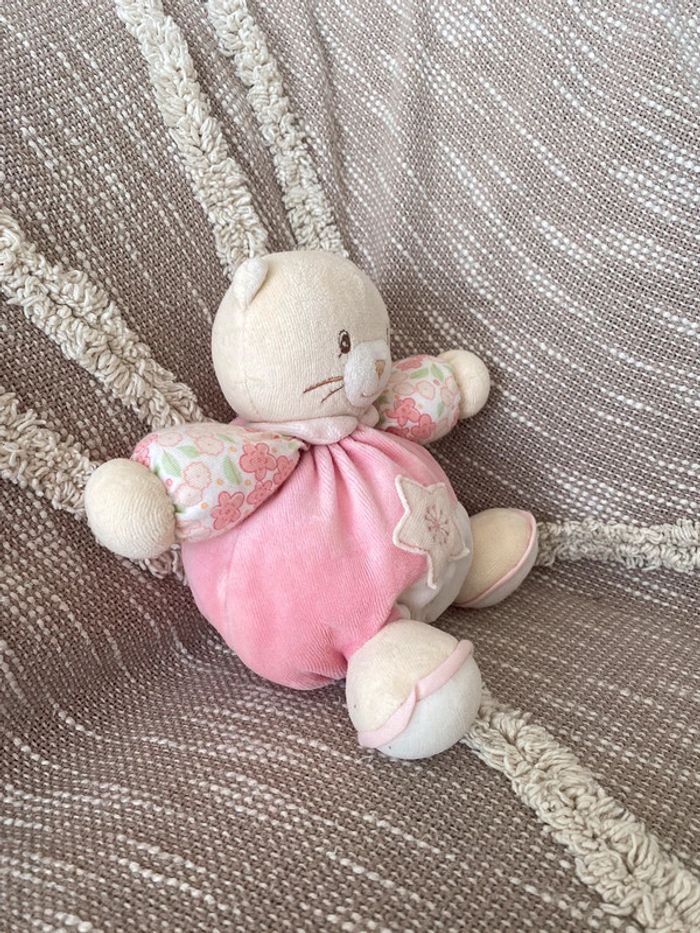Peluche doudou 17cm kaloo chat rose et blanc à fleur très bon état - photo numéro 1