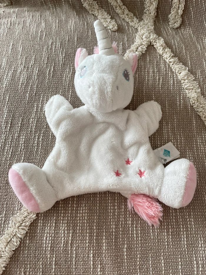 Peluche doudou marionnette 24cm tex licorne blanche et rose étoile très bon état