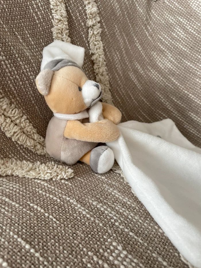 Peluche doudou mouchoir 16cm Babynat ours marron blanc gris beige très bon état