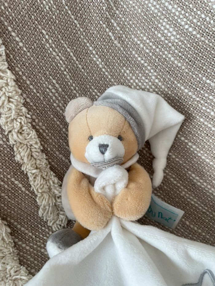 Peluche doudou mouchoir 16cm Babynat ours marron blanc gris beige très bon état - photo numéro 3