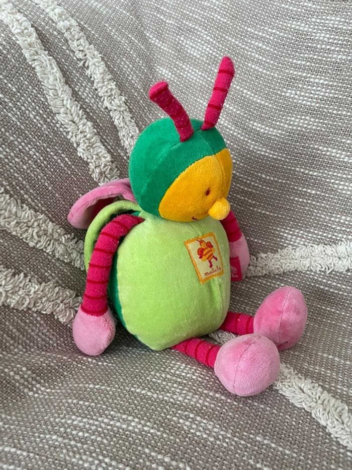 Peluche doudou 28cm moulin roty abeille coccinelle vert et rose très bon état - photo numéro 1