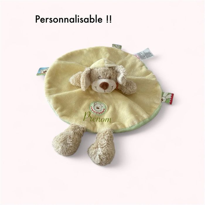 Peluche doudou plat rond 23cm nicotoy chien à capuche jaune et beige très bon état