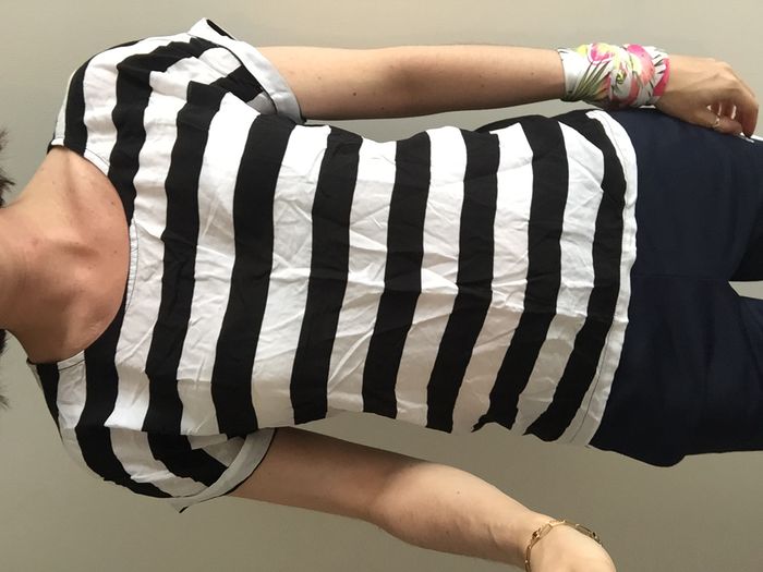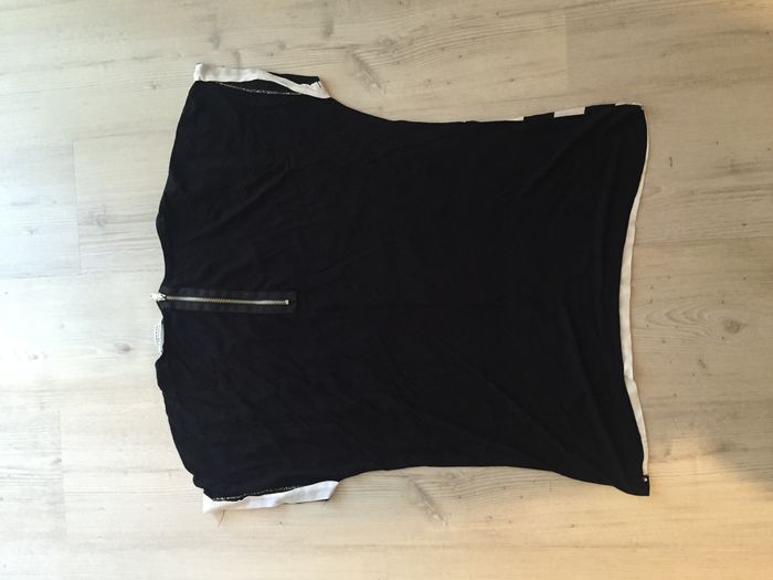 T-shirt avec rayures blanches et noires, léger et fluide, taille S, fermeture zip dans le dos.