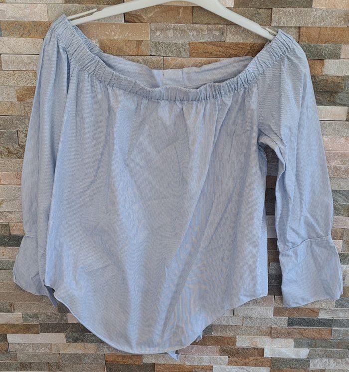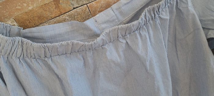 Blouse rayé bleu clair et blanc manche 3/4 de la marque Mango en taille 36. En très bon état. Peut être porté avec les épaules dénudées.