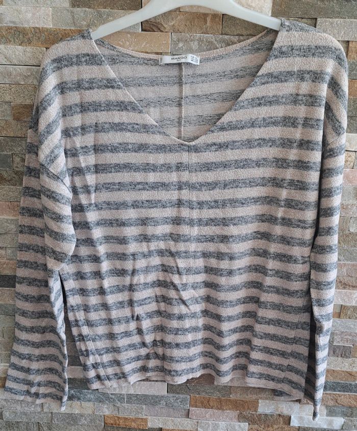 Pull rayé beige et gris de la marque Mango en taille 34. En très bon état.