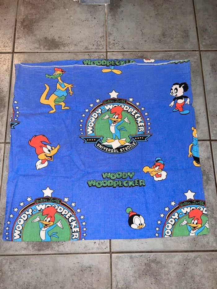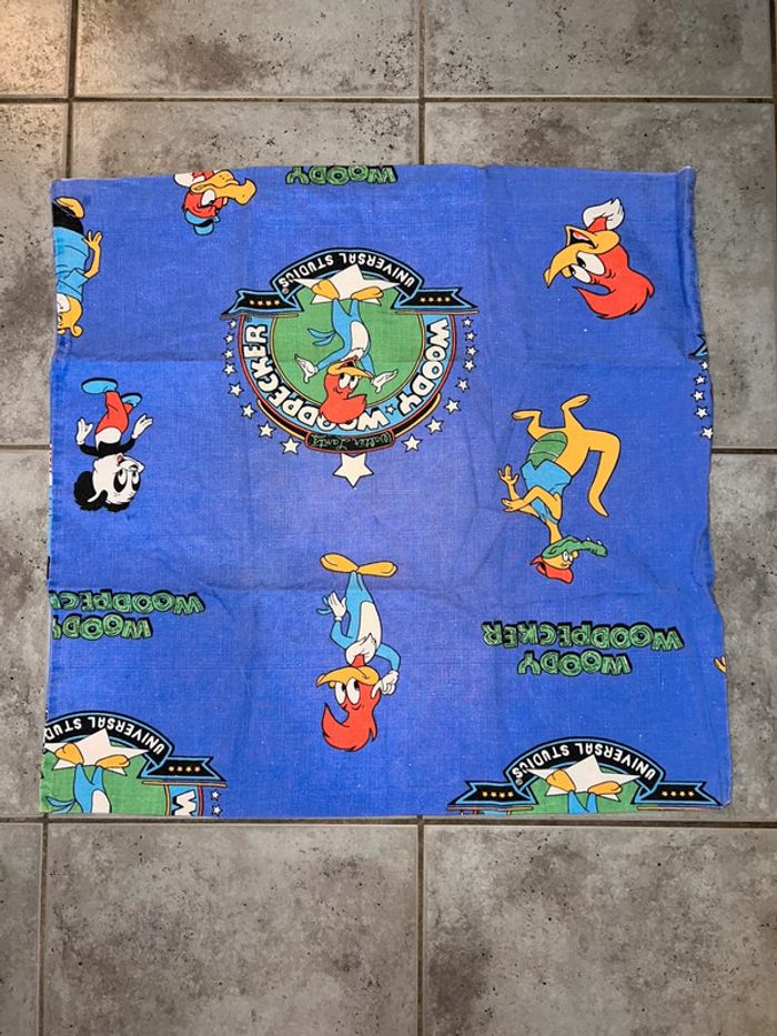 Housse d’oreiller, taie d'oreiller, protège oreiller vintage de Woody Woodpecker. Dimensions env. : 56 x 56 cm En bon état voir photos.