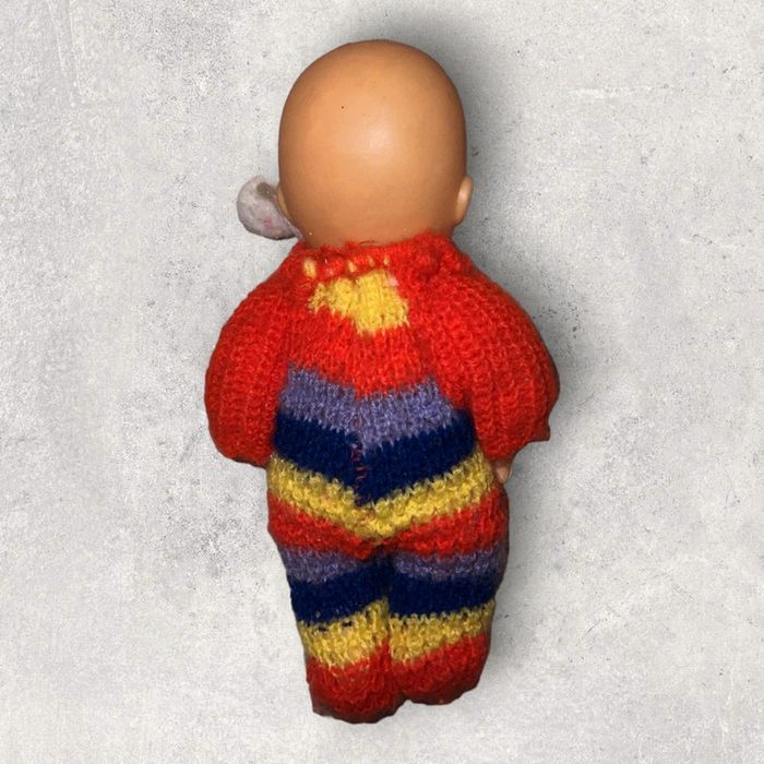 Cette charmante poupée ancienne des années 60-70 incarne l'innocence et le charme de cette époque révolue. Mesurant 16 centimètres environ , ce petit bébé garçon aux cheveux blonds arbore une adorable mèche blonde au milieu, encadrant ses grands yeux bleus étincelants. Il est vêtu d'une combinaison en tricot, ajoutant à son aspect douillet et rétro.