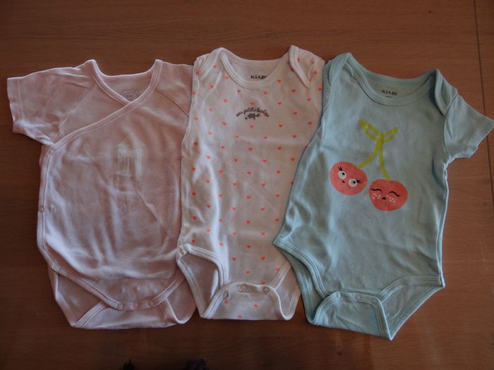 Lot de 3 bodies manches courtes pour bébé fille. Marques Kiabi et Brioche (la Halle). Rose clair, blanc avec cœurs oranges et bleu clair motif cerises. Vendus en lot mais possible vente à l'unité (1€).