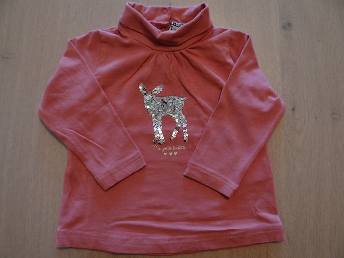 Kaki très foncé pour salopette, corail foncé pour tee-shirt avec motif biche en sequins.