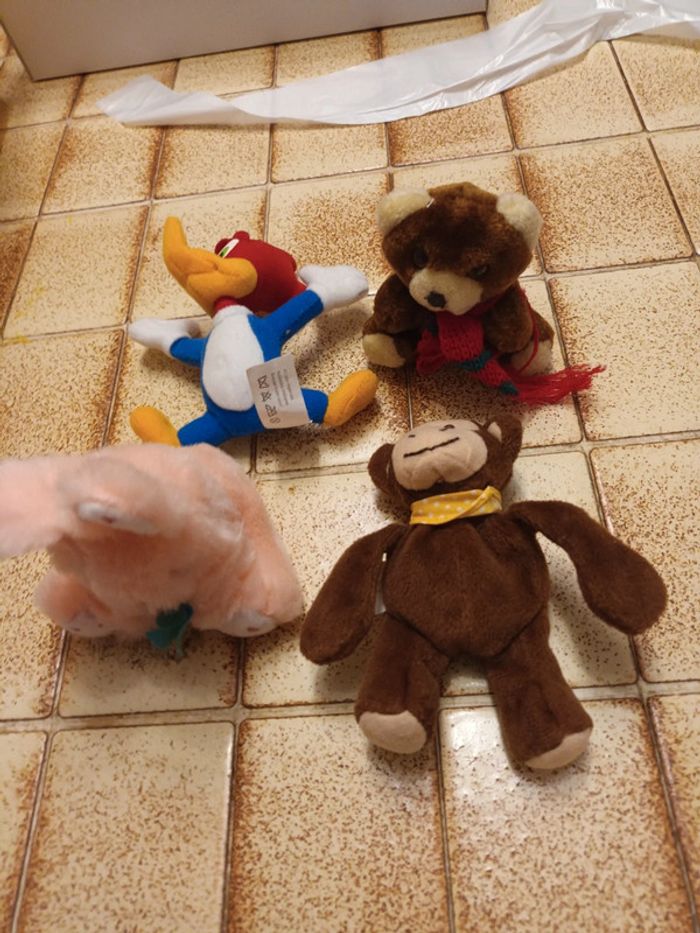 Lot de 4 peluches 1 lapin, 1 Woody wood pecker, 1 singe et 1 ours Bon etat