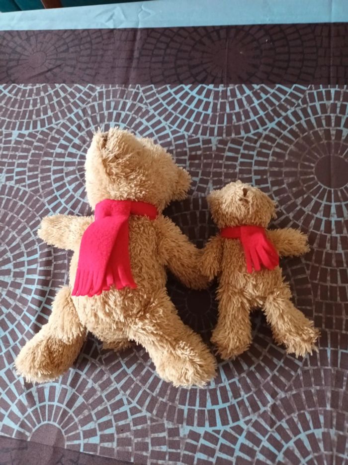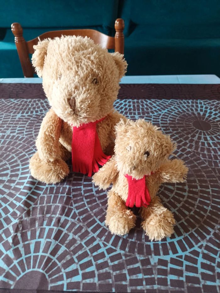 Peluche ours Avec son bébé Echarpe rouge Très bon etat