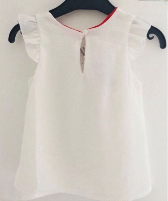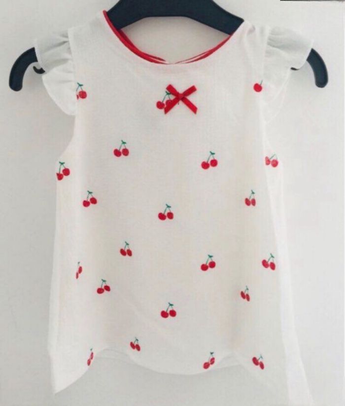 Je vends une robe blanche avec motifs cerise, neuve. Taille : 12 mois. Disponible aussi en 9 mois.