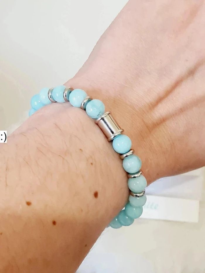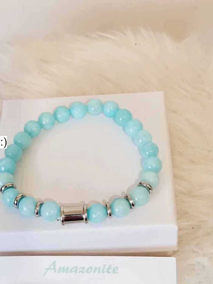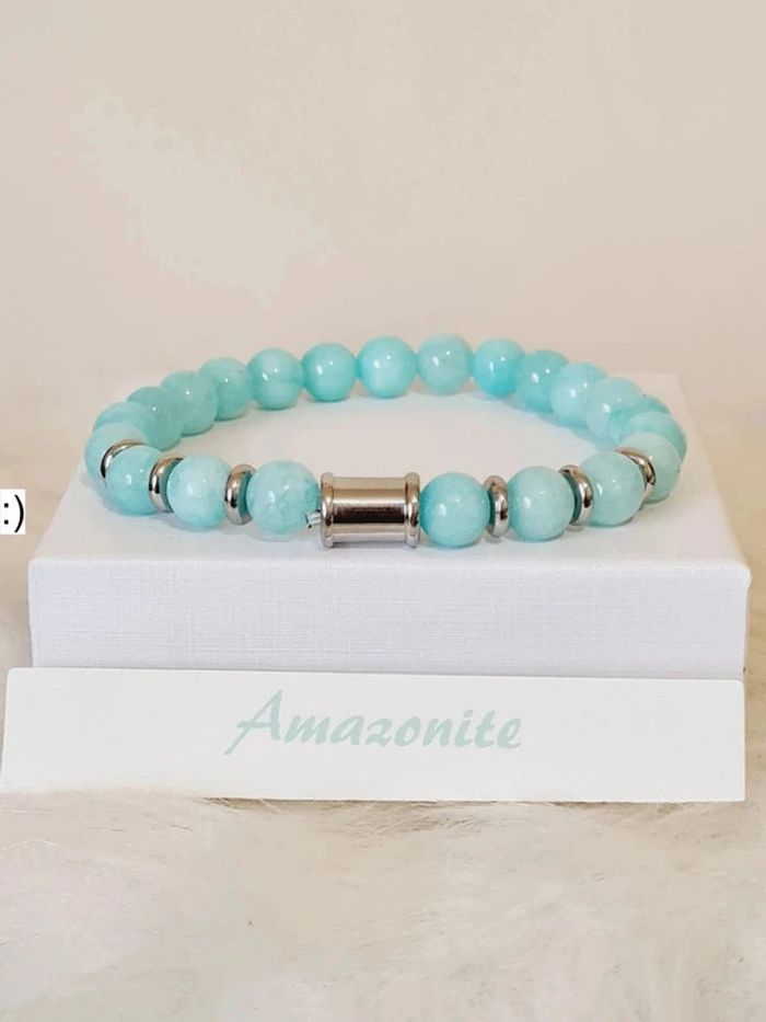 Bracelet NEUF en pierres naturelles de 8 mm d'Amazonite et acier inoxydable couleur argent Taille élastique ajustable jusqu'à 18 cm Facture jointe, vendeur pro ✅️ #amazonite #pierre #naturelle #bijou #Lithothérapie #bracelet