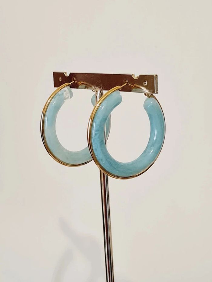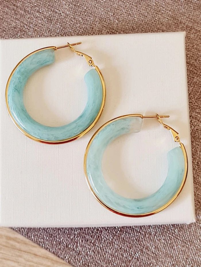Créoles NEUVES dorées & bleu ciel en acier inoxydable et résine Diamètre total : 4 cm HYPOALLERGÉNIQUES ✨️sans plomb, nickel ni cadmium ✅️ ne rouillent pas ne noircissent pas 🥰 résistent à l eau 💧 Facture jointe, vendeur pro 🌹 #bijou #doré #acierinoxydable #bouclesdoreilles #créoles #stainlesssteel #gold #mode #accessoires #gioielli #jewelry #Schmuck #gioielleria