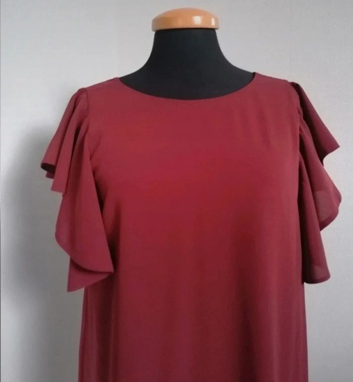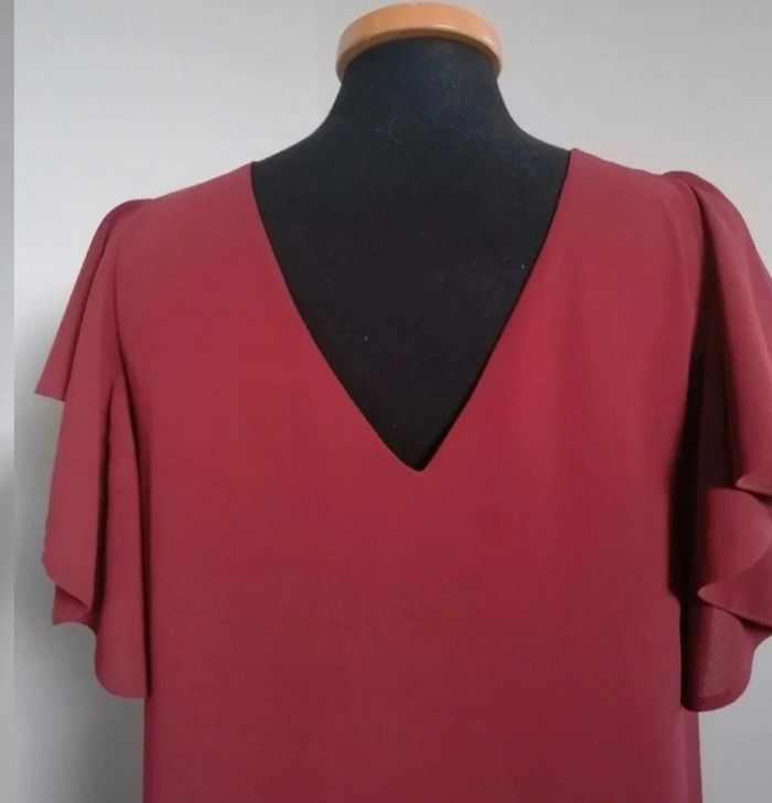 Très jolie robe fluide avec petites manches volantées. Col rond devant Col V derrière Porté qu'une ou deux fois comme neuve
