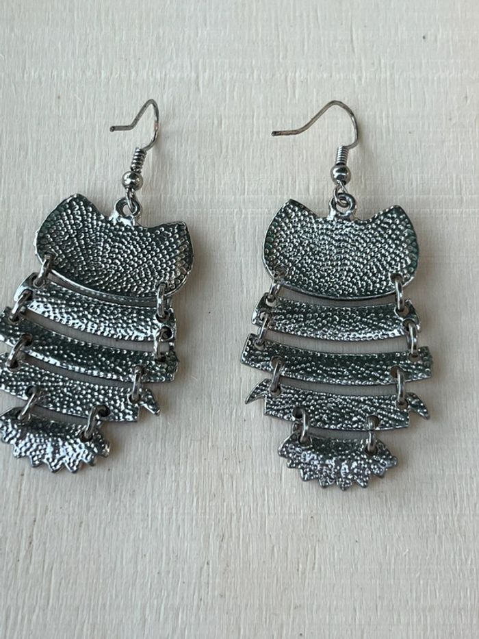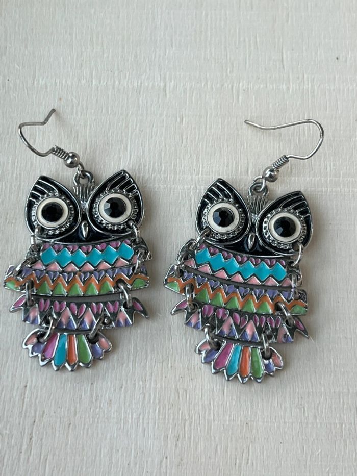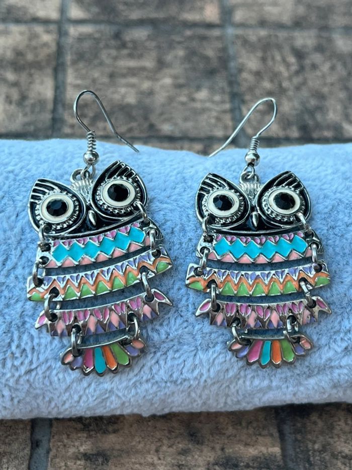 Boucles d’oreilles pendantes hiboux multicolore fantaisie parfait état - photo numéro 1
