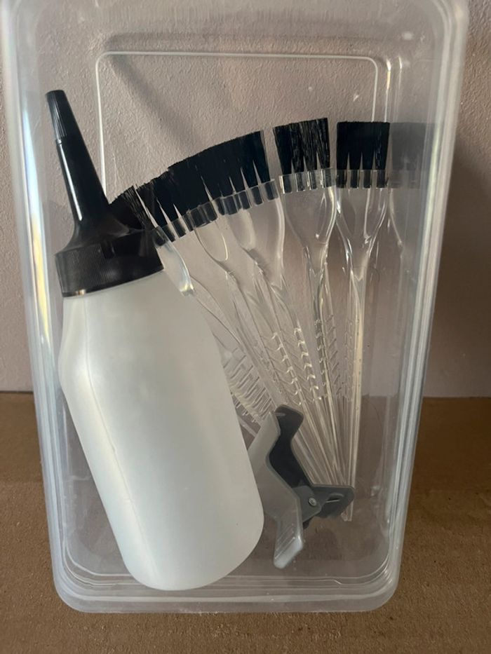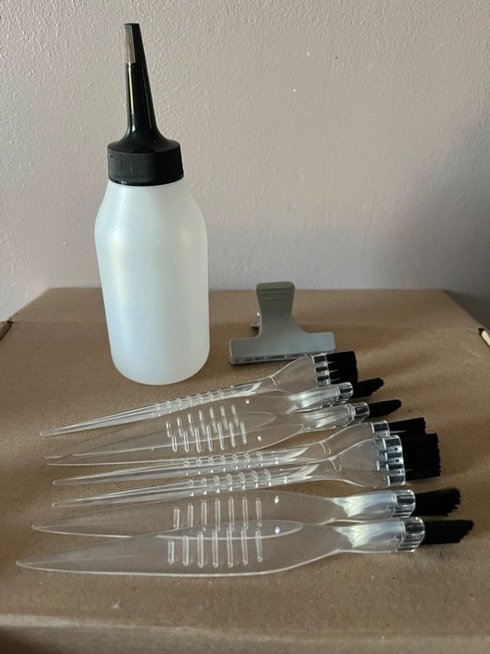 Lot d’accessoires soins cheveux : pinceaux application couleur et flacon mélangeur neufs