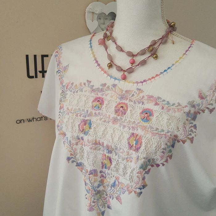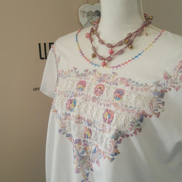 Collection printemps été ☀️ Préparons les beaux jours 👍 Jolie blouse blanche en coton ou similaire de réalisation ethnique probablement. Brodée de couleurs pastel. Pas de taille indiquée. Pas d’étiquettes. Portée ici par mon mannequin en 38 40. Largeur sous aisselles environ 60 cm Peut convenir jusqu'au 42 voire plus. Longueur environ 60 cm. Style bohème chic Idéal pour une soirée, cérémonie, mariage, fête etc.. Envoi rapide et soigné 👍 Mes autres hauts, t-shirt, tuniques, blouses, chemises : #cloclodaloshirt Pensez à poser vos questions avant achat car je réponds volontiers et je suis très disponible mais je n'accepte pas de retour ensuite sauf erreur de ma part bien sûr ⚠️ #broderie #brodé #cotonblanc #cotonbrodé #bohemechic #boheme #champêtre #fête #soirée #wedding #chic #champêtre #champetrechic #ethnique #centpourcentcoton #pastel #arcenciel #hippie #bohemechic #bohème #robeplage #robecoton #robebohemechic #robenaturelle #centpourcentcoton #cotonrecyclé #cotonécologique #styleboheme #stylehippie #naturalwear #robeblanche4042 #tuniquelongue #tuniqueblanche #tuniquebohème #tunique4042 #tuniquecoton #tuniqueconfort #tuniquenatural #tuniquelarge #tuniquecotonblanc #pepite