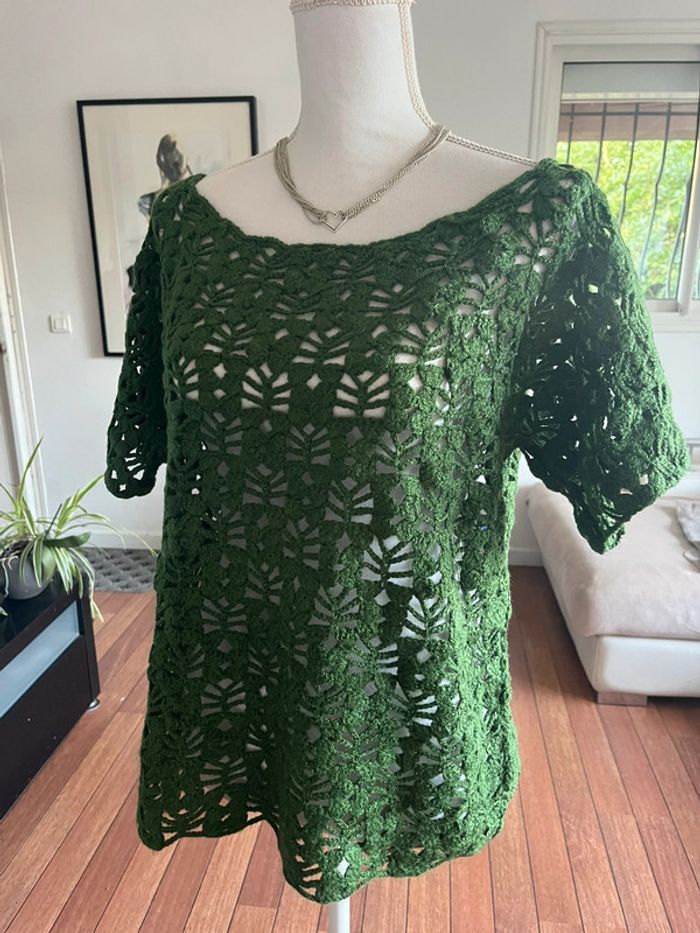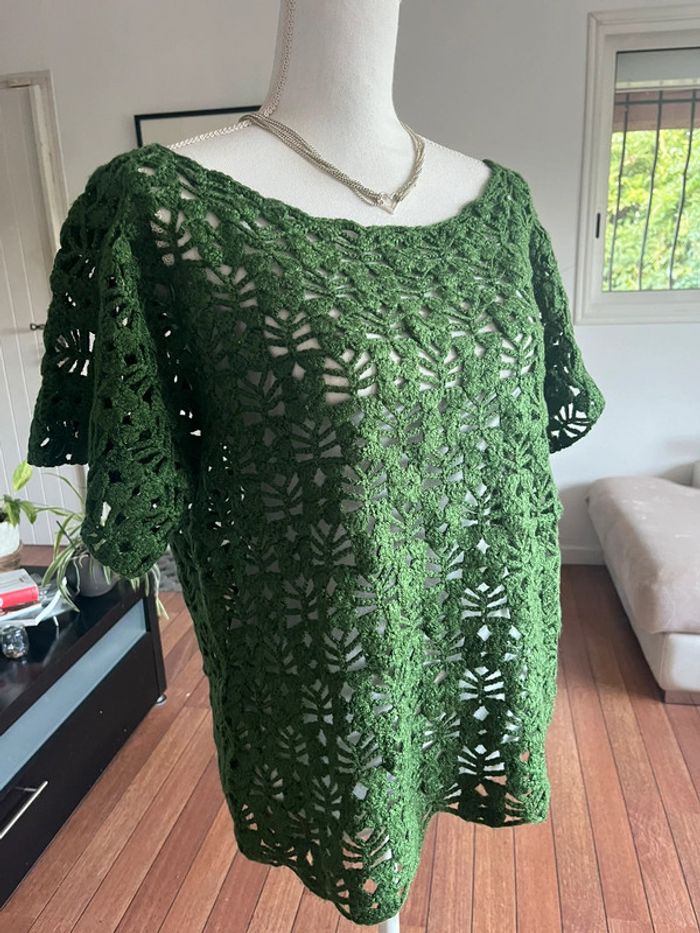 Superbe pull mailles crochet vert sapin fait main - photo numéro 1