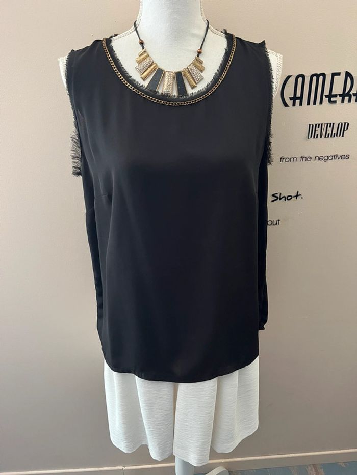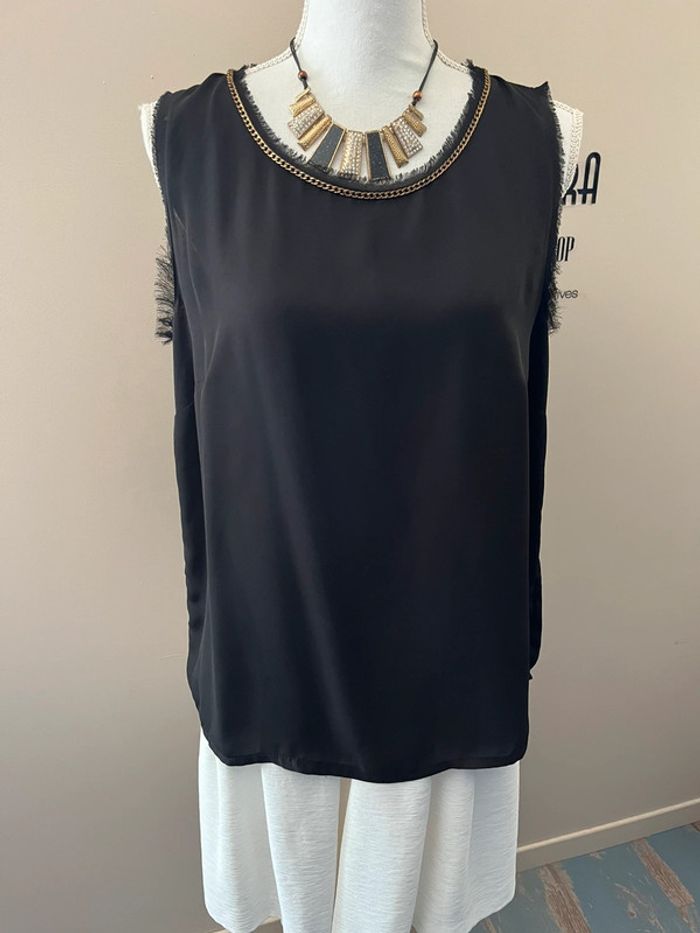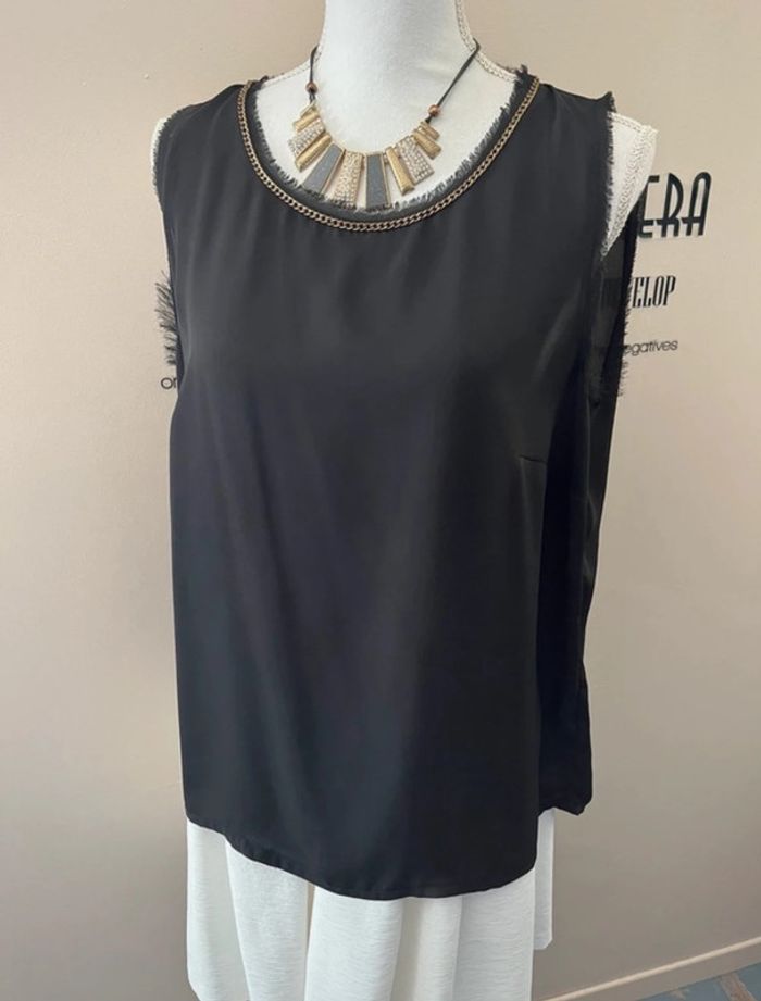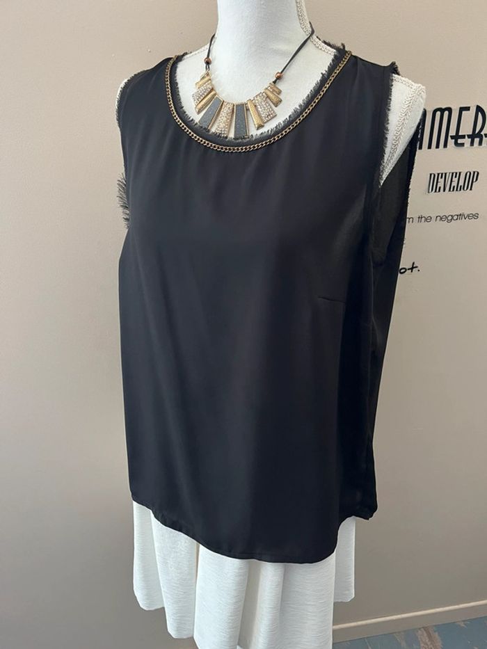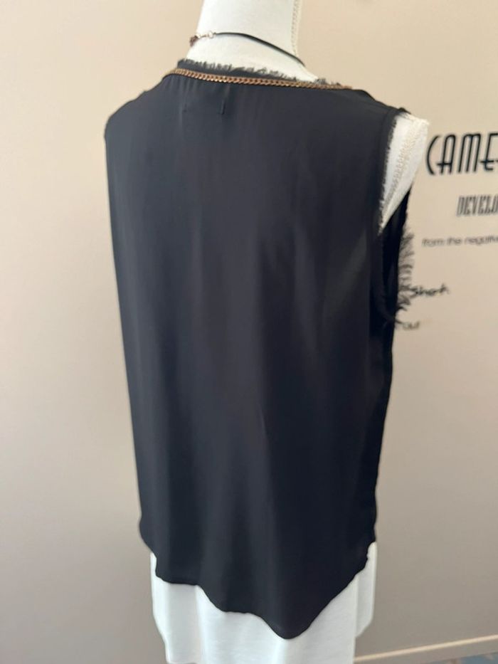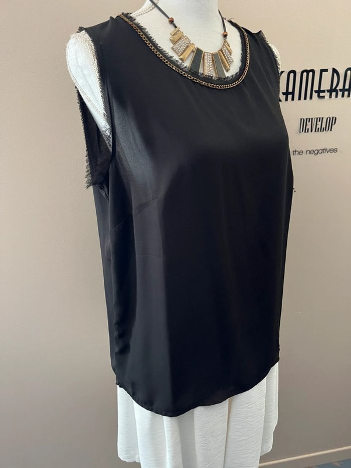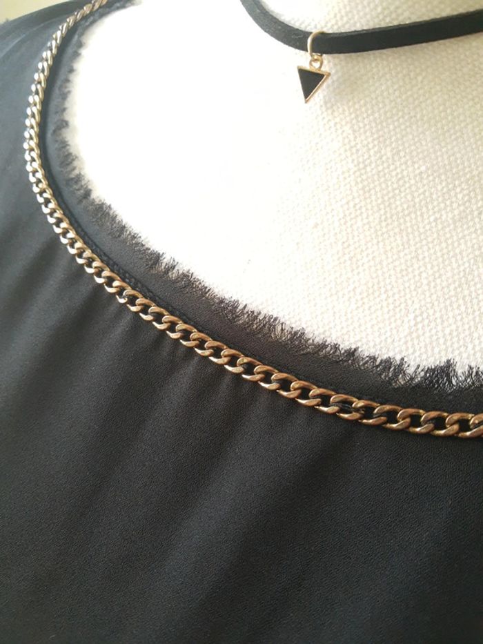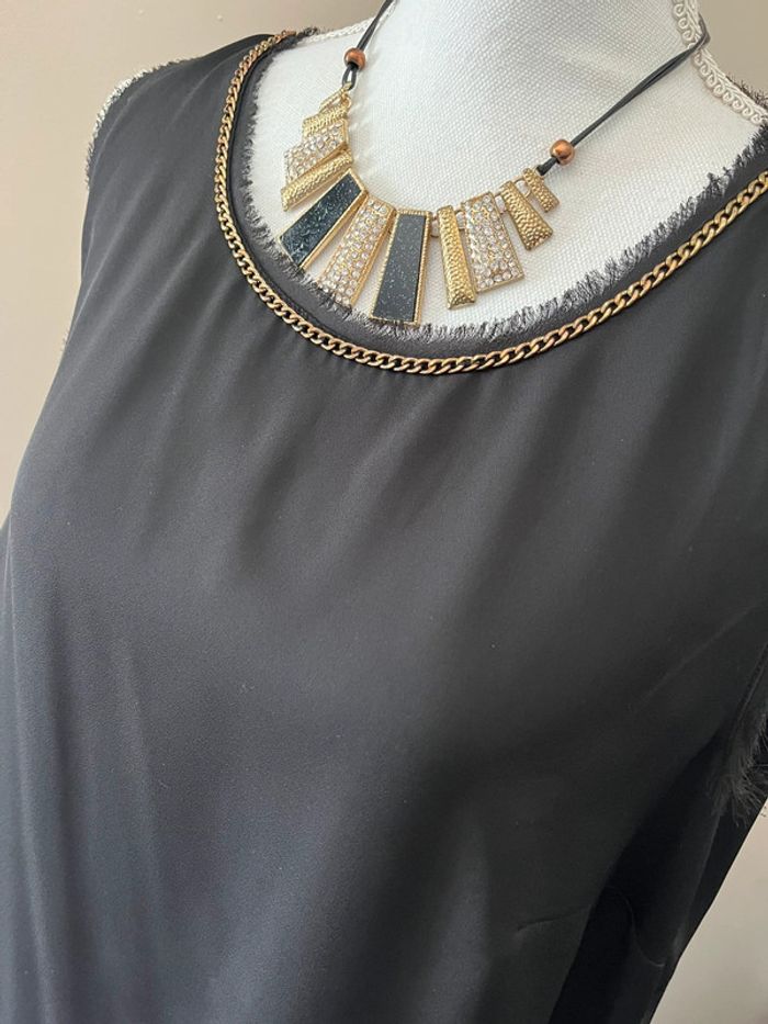 Blouse tunique longue fluide noire sans manches col chaîne dorée