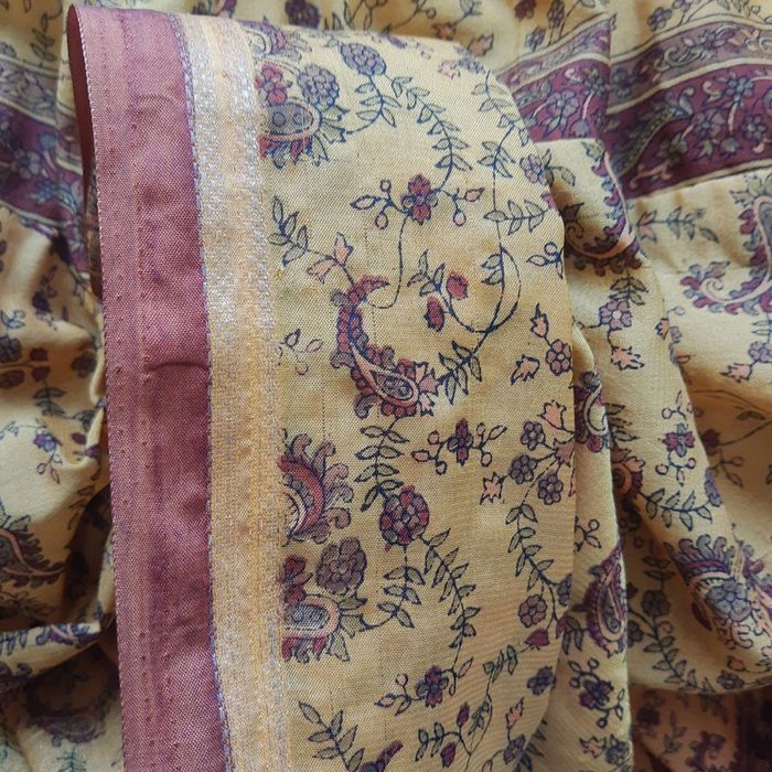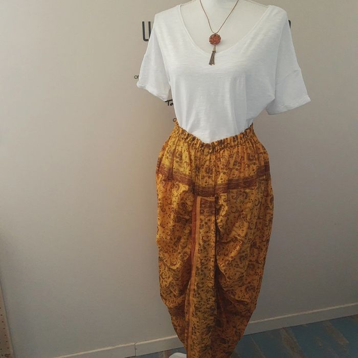 Collection printemps été ☀️ Les beaux jours sont là 👍 Joli saroual fluide et léger , agréable à porter. Matière souple et légèrement satinée Taille élastique étirable largement jusqu'à 58 cm. Imprimé ethnique coloré dans un camaïeu de couleurs chaudes jaune orangé Pas de taille indiquée mais porté ici par mon mannequin en 38 40 sans difficultés 👍 et taille élastique étirable jusqu'à 58 cm donc modèle pouvant convenir à de nombreuses tailles et morphologies. Très bon état général car rarement porté mais un petit accro réparé au thermocollant (dernière photo). ⚠️ Pas d'étiquette intérieure. Envoi rapide et soigné 👍 Pensez à poser vos questions avant achat car je réponds volontiers et je suis très disponible mais je n'accepte pas de retour ensuite sauf erreur de ma part bien sûr ⚠️ #saroual #sarouel #saroualethnique #pantalonconfortable #pantalonsouple #pantalonfluide #sarouelsatin #imprimécoloré #impriméetnique #fluide #leger #coloré #ethnique #confortable #sarouel40 #sarouel42 #sarouel44 #sarouelfemme #sarouels #sarouelindien #styleboheme #stylebollywood #stylebabacool