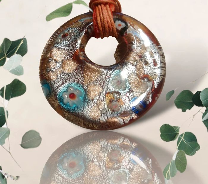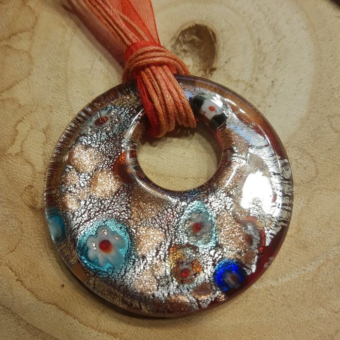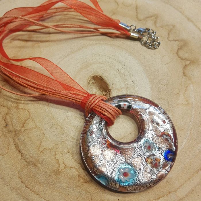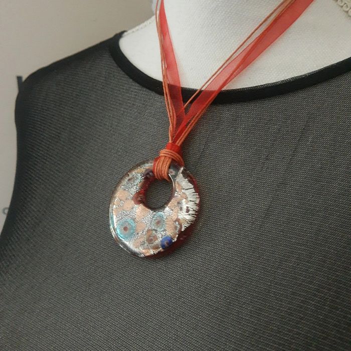 Très gros pendentif rond irrisé monté sur collier ruban comme neuf - photo numéro 1