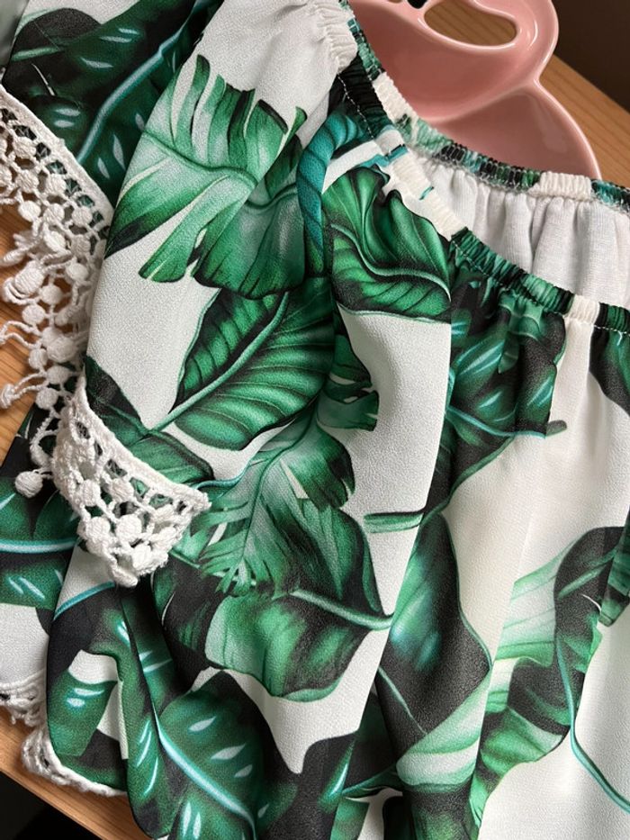 Blouse blanche chic col bardot imprimé motifs feuilles bordé dentelle taille unique
