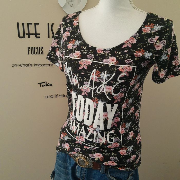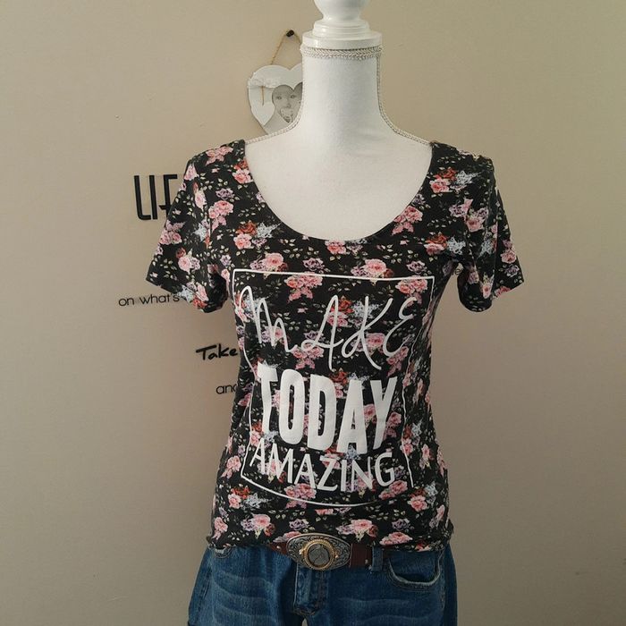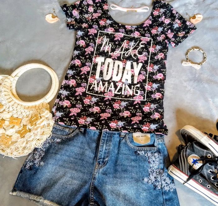 Collection printemps été ☀️ Préparez Les beaux jours 👍 Joli t-shirt fleuri sur fond noir avec écriture en blanc "make today amazing" L'imprimé est bucolique, avec un effet passé, pastel, d'origine. Matière coton doux et elasthane. Petites manches Taille M marque Mim Peut aller à un 38 40 comme sur mon mannequin. Assez long, couvre bien le ventre Le short en jean est disponible dans mon dressing également . Envoi rapide et soigné 👍 Mes autres articles en M #cloclodalo38 En L #cloclodalo40 Mes autres articles noir #cloclodaloblackdream Mes autres articles rose #cloclodalopinkdream Multicolore #cloclodalocolorfuldream Mes autres articles en coton #cloclodalocoton Articles Mim #cloclodalomimstyle CONDITIONS DE VENTE N'hésitez pas à poser vos questions avant achat car je réponds volontiers et je suis très disponible mais je n'accepte pas les retours ensuite sauf erreur de ma part bien sûr ⚠️ Pensez aussi à faire des lots pour économiser les fdp💡 Bon shopping à tous 🤗 #débardeur #débardeurfemme #débardeurnoir #debardeur38 #écriture #impriméfloral #imprimé #tshirtnoir #tshirtmim #tshirt38 #tshirt40 #mim3840 #femme3840 #tshirtmanchescourtes #boheme #tshirtimpression #fleuri #fleursmulticolores #écrituresblanches #impriméfleuri #impriméfleurs #buccolique