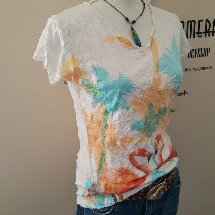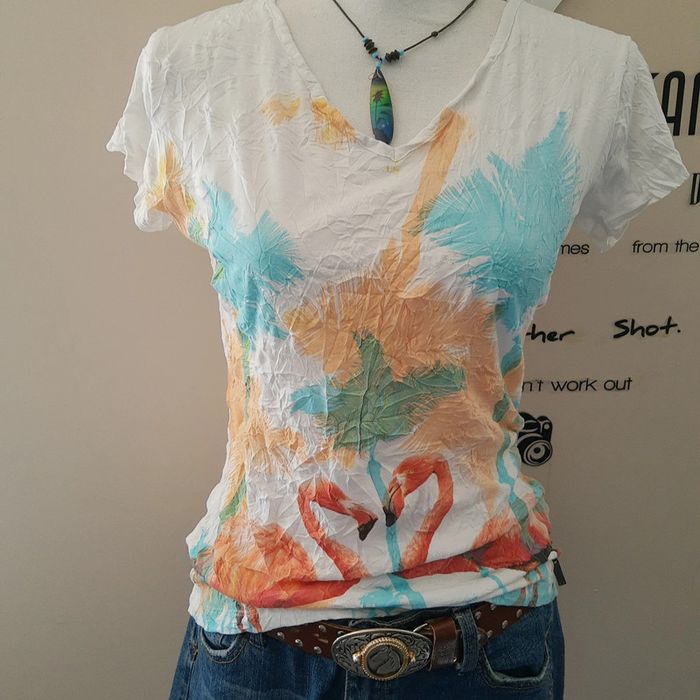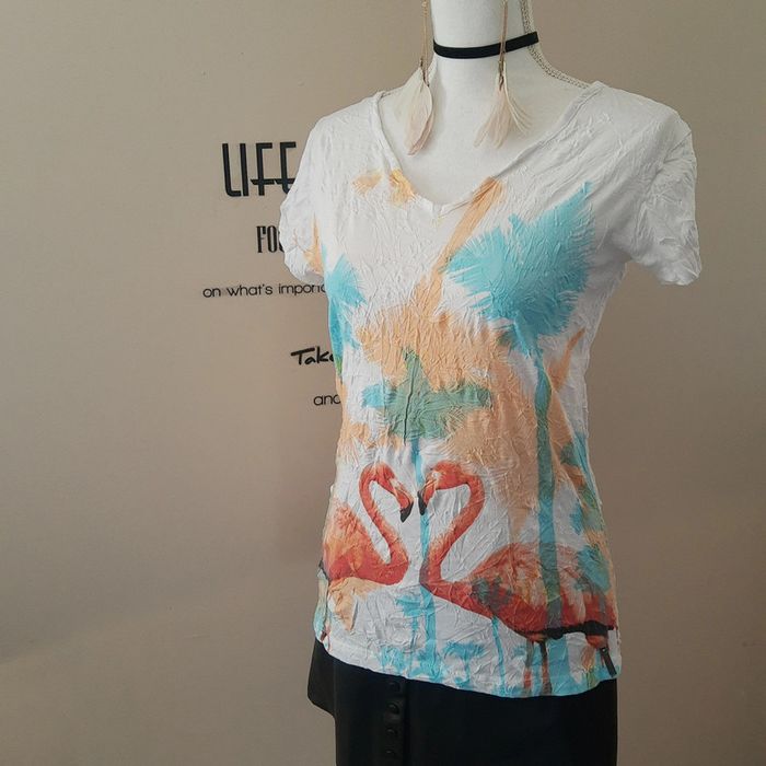 Collection printemps été ☀️ Préparez les beaux jours 👍 Très belle tunique blanche mi longue couvre bien le bas du dos Manches courtes Col V Tissus froissé permanent, pratique pour la valise.. Très belle impression colorée devant avec un couple de flamands roses. Mélange Poly Coton Marque Firefly taille M Comme neuve je l'ai juste lavée à réception par mesure d'hygiène. La jupe en cuir Zara n'est pas disponible à la vente mais le short en jean oui. Envoi rapide et soigné 👍. Mes autres articles en M #cloclodalo38 Mes autres articles rose #cloclodalopinkdream Mes autres articles blanc #cloclodalowhitedream Mes autres articles neufs #cloclodaloneuf Mes autres articles en coton #cloclodalocoton CONDITIONS DE VENTE N'hésitez pas à poser vos questions avant achat car je réponds volontiers et je suis très disponible mais je n'accepte pas les retours ensuite sauf erreur de ma part bien sûr ⚠️ Pensez aussi à faire des lots pour économiser les fdp 💡 Bon shopping à tous 🤗 #tshirtfemme #tshirtfilleM #polycoton #tshirtcotonneuf #tshirtmanchescourtes #tshirtimprimé #tshirtcolv #tshirtrose #tshirtflamandsroses #tshirtflamandrose #flamandrose #flamandsroses #tshirtfroissé #tshirt38 #tshirtcoloré #blousecolv #blouseimprimée #blousecolorée