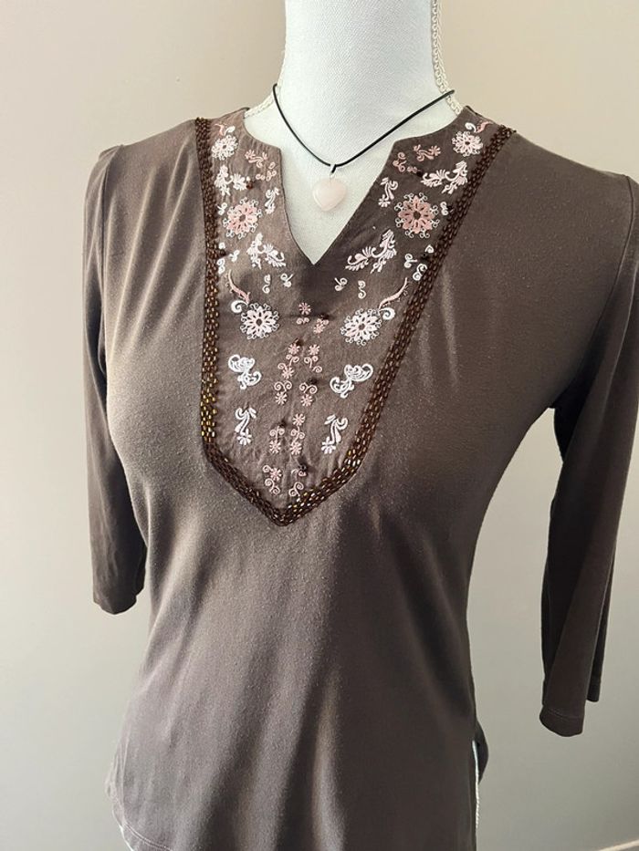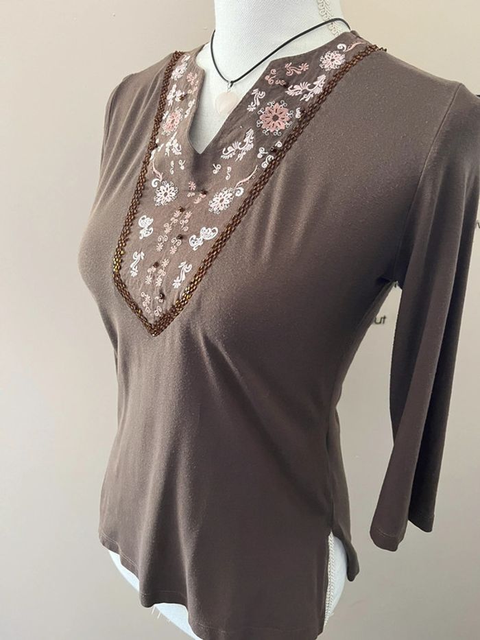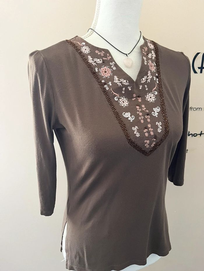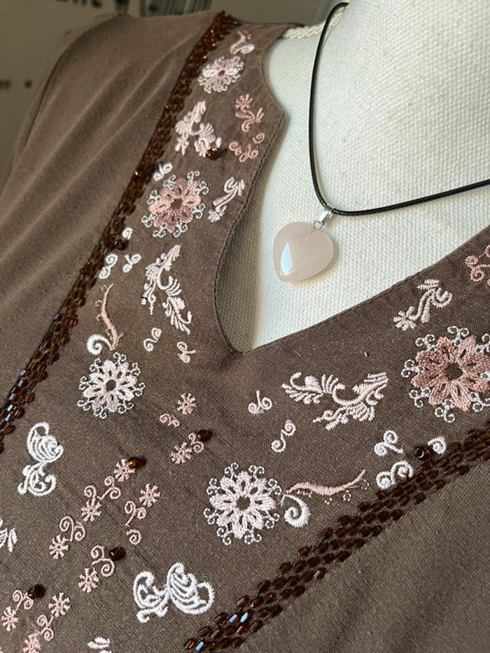 Blouse Caroll marron viscose et coton brodé motif fleurs - photo numéro 2
