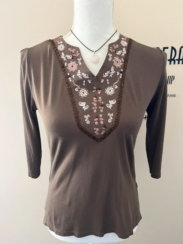 Blouse Caroll marron viscose et coton brodé motif fleurs - photo numéro 1