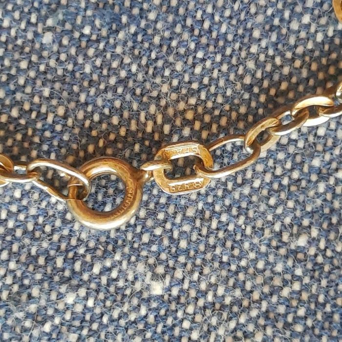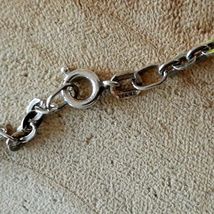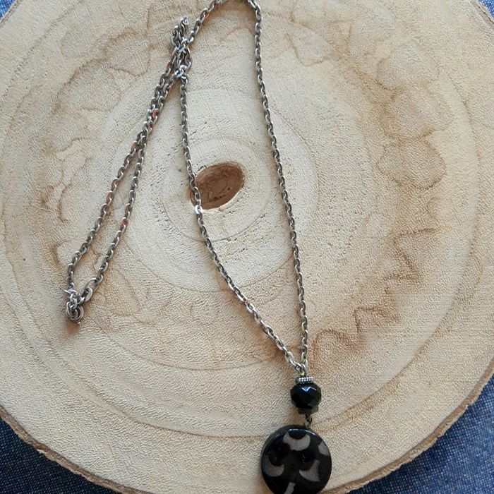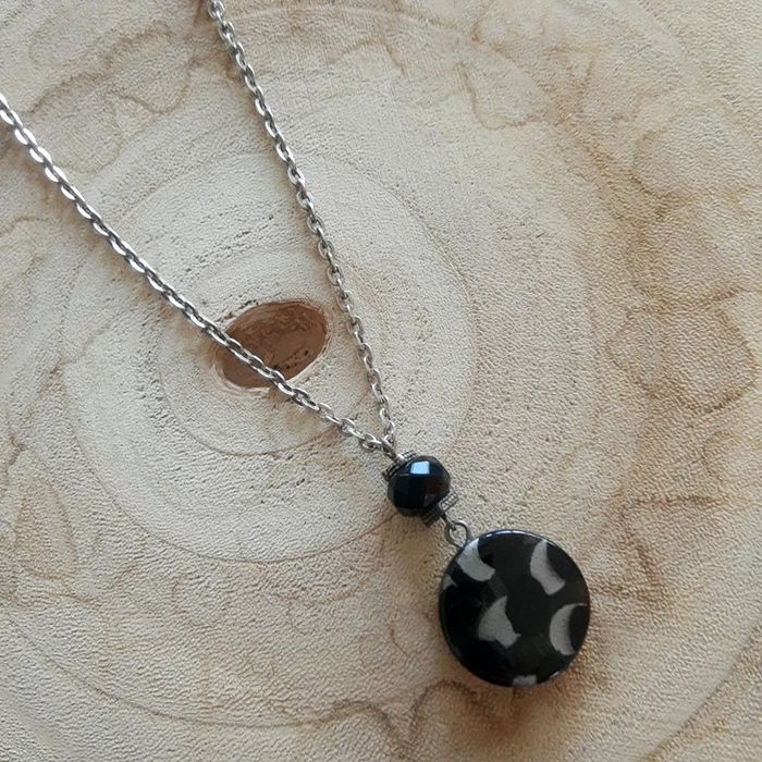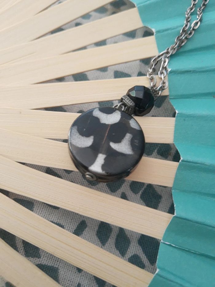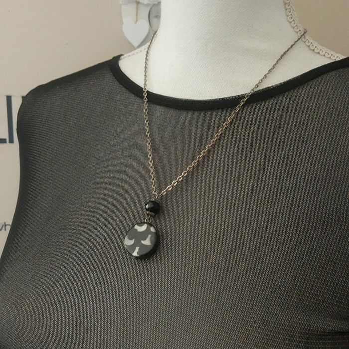 Joli sautoir mi long (voir photo portée) en argent 925, terminé par une perle et un médaillon en résine noir gris..